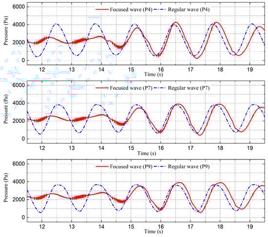 Comparison of the bow slamming pressure between the focused wave and regular wave with wave height = 0.12 m, pressures probes located at P4, P7, and P9.