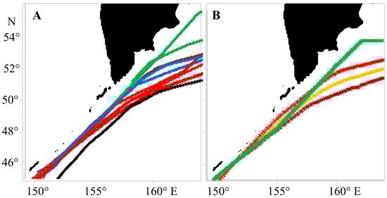 Underway measurement tracks. (A) winter (red—13—15.01.1998, 09—11.02.2000, 15—16.03.2000, 01—03.02.2018; brown—30.01.—01.02.1999, 14—16.03.1999; black—27—28.01.2001; blue—31.01.—02.02.2003, 28—29.02.2020; green—16—18.01.2013, 16—18.02.2013), (B) spring–summer (light brown—13—15.06.1995, dark brown—16—18.07.1998, red—01—03.07.1999, green—19—21.04.2013).