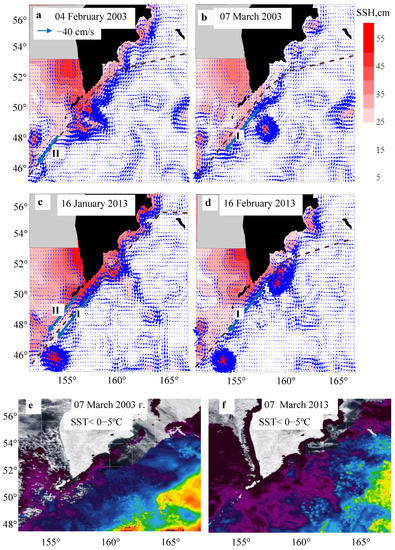 The SSH, geostrophic current velocity (a–d), and SST (purple indicates negative temperatures) (e,f) distributions in the winter of 2003 and winter of 2013. Brown dashed lines (a–d) show the location of the sections where seawater parameters were measured; blue arrows indicate the coastal (II) and off-shore (I) branches of the EKC.