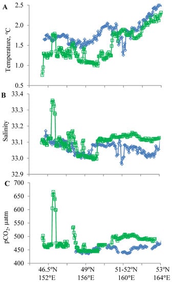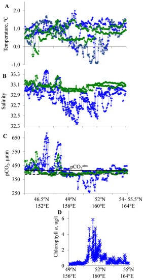 The distributions of temperature, salinity, and pCO2 in the central Kuril Islands region (45–48° N, 150–155° E) were related to water circulation. Increased salinity (33.1–33.3) and high pCO2 values (500–650 µatm) were observed in the Rickorda Strait zone (Figure 4B,C: 151–153° E) and Kruzenshterna Bank area (Figure 4B,C: 154–155° E), where due to tidal mixing, the surface water is enriched with pCO2. The Rickorda Strait area (Nadezdy, Rickorda, and Diana straits), with an average depth of 160–240 m, is characterized by high velocities of tidal currents (2–4 m/s), which contribute to tidal mixing and water transformation [].