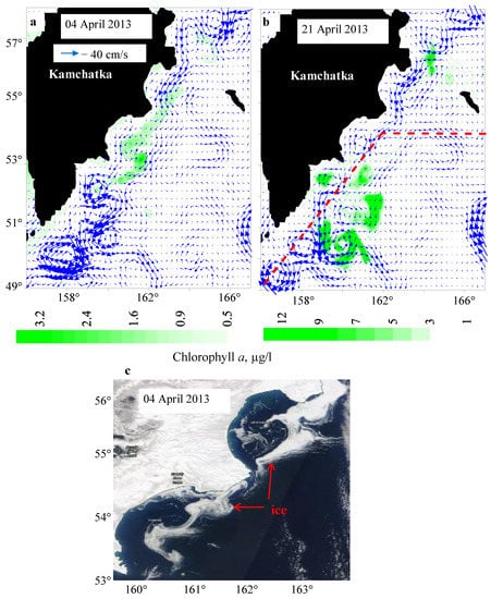 The surface current velocity maps and chlorophyll a concentration distribution (4 April and 21 April 2013) (a,b) and satellite image of the eastern Kamchatka region (c).