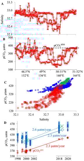 The salinity (A) and pCO2 (B) distribution in the western subarctic North Pacific in summer (See Figure 2b) (red squares—13–15.06.1995, red strokes—16–18.07.1998, red crosses’—01–03.07.1999) and pCO2 versus (C) (blue diamonds—winter (1998–2003, 2013), red squares—summer (1995, 1998, 1999), green crosses—winter 2018 and winter 2020) and change in the seawater (diamonds—water with a salinity of 33.00–33.05, crosses—water a salinity of 33.05–33.10) and atmospheric pCO2 in the study area (D)).