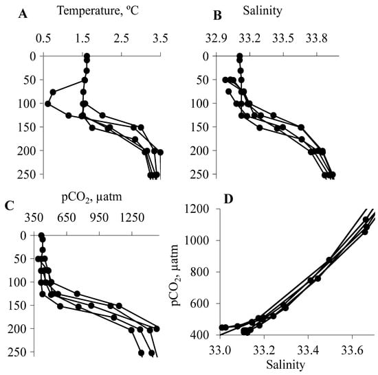 The depth profiles of the temperature, salinity, and pCO2 (A–C) and pCO2 versus salinity (D) (47° N, 160° E, winter–spring 2010, 2012, and 2013).