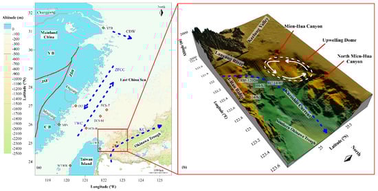 The area around SOT has developed complex topography characterized by the ECS slope, the North Mien-Hua Canyon, the Mien-Hua Canyon, Keelung Valley, and I-Lan Ridge (Figure 1). The hydrologic environment in this region is influenced by ocean large-scale and mesoscale ocean dynamic processes, including the Kuroshio Current, internal tides, upwelling, and cyclonic eddies (Figure 1b) [,,,,].