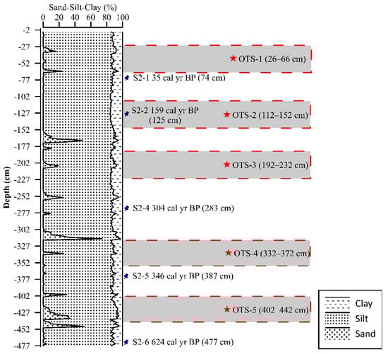 Most grains analyzed in this study have a size of 36.21–89.18 μm and are mainly concentrated in the silty fraction, which is common in H4-S2 (Figure 2). In previous studies, the grain-size effect on the detrital zircon age distributions was mentioned []. For the case of this study, although the median grain size distributions of detrital zircon in OTS-1, OTS-2, OTS-3, and OTS-4 are relatively finer than OTS-5, no specific correlation of zircon age and grain size was noted (Figure 7). There was also no correlation between the grain size and zircon age in the same sample, meaning that older zircon grains were not necessarily finer (Figure 7).