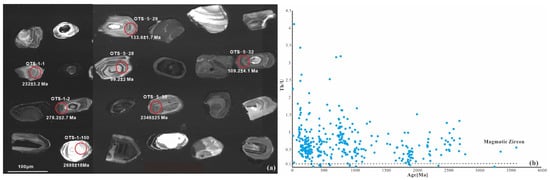 Most zircon grains are igneous in origin according to oscillatory zoning (Figure 3a) and Th/U > 0.1 (Figure 3b) [,,]. Thus, 75–93 valid ages (427 in total) were obtained for each sample (Table S1).