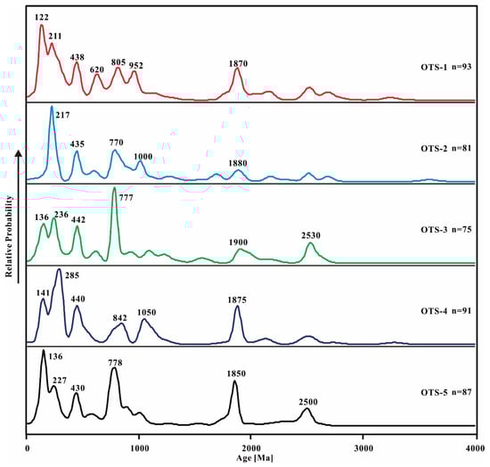 Kernel density estimation (KDE) plots for detrital zircon U-Pb ages of OTS-1 to OTS-5 in H4-S2. Please refer to Table S1 for detailed data. The results of OTS-1 and OTS-2 are reprocessing of the previous data []. The values of major age peaks are marked in this figure.