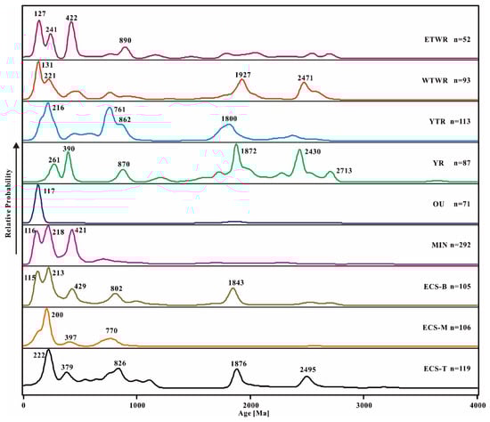 The U-Pb age distribution of the detrital zircon in the potential provenance areas is mainly characterized by the following characteristics (Figure 5): (1) The detrital zircon in the sediments of the Lanyang river and Zhuoshui river is represented by seven main age groups: 200–100 Ma, 300–200 Ma, 550–360 Ma, 850–700 Ma, 1.1–0.9 Ga, 2.0–1.8 Ga, and 2.6–2.4 Ga. The age distribution of the Zhuoshui river is relatively simple, with a higher proportion of Phanerozoic zircons, but the Zhuoshui river has a more complex age composition and more Precambrian zircons []. (2) The detrital zircon of Changjiang-derived sediments shows five major age groups: 300–100 Ma, 600–400 Ma, 900–700 Ma, 2.0–1.7 Ga, and 2.6–2.2 Ga [,]. The distribution characteristics of Changjiang-derived and Huanghe-derived sediments are completely different, with four main age groups: 500–200 Ma, 1000–800 Ma, 2.0–1.5 Ga, and 2.8–2.2 Ga []. In addition, the age peak of the Huanghe-derived sediments appeared in the Paleoproterozoic, which is also an important signal to distinguish the two provenance areas (Changjiang and Huanghe). (3) The age distribution of the detrital zircon in Oujiang is simple, distributed in the ranges of 200–60 Ma and 2.4–1.8 Ga; (4) Minjiang is mainly distributed in the range of 1.0 Ga–60 Ma, and the remaining particles were distributed in the range of 3.3–1.2 Ga [,,]. The age ranges of Oujiang and Minjiang are obviously younger than those of Changjiang and Huanghe, which also provides a basis for distinguishing different provenance areas for this study. (5) Due to the different locations, the age distribution of the East China Sea shelf is different. ECS-B has four main age groups: 600–60 Ma, 1.2 Ga–700 Ma, 1.9–1.6 Ga, and 2.7–2.4 Ga; ECS-M has two main age groups: 500–3 Ma and 1000–600 Ma; and ECS-T has three main age groups: 1.2 Ga–100 Ma, 2.1–1.8 Ga, and 2.6–2.4 Ga [].