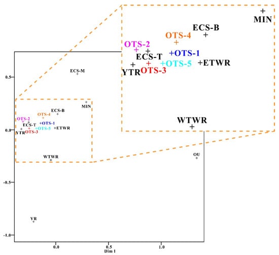 The 700–900 Ma age component, especially the peak at ~761 Ma, is the diagnostic characteristic of the Yangtze River []. This identification sign of the Yangtze River is of great significance to distinguish other potential provenance areas of SOT, since there is no significant peak at ~761 Ma in other provenance areas except the Yangtze River (Figure 5). This component and peak prevail in OTS-3 and OTS-5 (Figure 4), indicating that sediments from the Yangtze River and southern Okinawa Trough are of the same origin. In addition to the 700–900 Ma age group, 100–200 Ma, 200–300 Ma, and 400–500 Ma are also the primary age components in H4-S2 (Figure 4). These groups cannot be used to accurately determine their sources since they coexist in the Lanyang river, Zhuoshui river, Minjiang, and the East China Sea shelf (Figure 5). The same feature is also present in the 1.8–2.0 Ga and 2.5–2.7 Ga age groups. However, it is simpler due to the fact that only the Zhuoshui river, the Yangtze River, and the East China Sea shelf provide for these groups. Although the age distribution characteristics of the Yellow River and Oujiang are listed in this study (Figure 5), they are not potential provenance areas for the following reasons: (1) Oujiang-derived sediments only contain Mesozoic grains, which are not similar to any H4-S2 samples; (2) the modern Yellow River estuary is so far away from the southern Okinawa Trough that there is no evidence of sediments migrating to this region; and (3) sediments from the Yellow River are characterized by high concentrations of Archean zircon, which are completely different from H4-S2 (Figure 4 and Figure 5). The MDS maps more clearly show the source-sink relationship between H4-S2 and provenance areas (Figure 6). OTS-2, OTS-3, and OTS-5 were close to YTR and ECS-T. OTS-1 and OTS-4 were closer to ETWR (Figure 6). The results of MDS indicated that Lanyang river may be the source of detrital zircon grains in OTS-1 and OTS-4. Grains in OTS-2, OTS-3 and OTS-5 may be derived from the East China Sea shelf and Yangtze River. All of the provenance analyses indicated that the detrital zircon, which was found in H4-S2 in the past 624 a BP, originated from a mixture of sediment supplies from Taiwanese rivers, the East China Sea shelf, and the Yangtze River. This understanding is consistent with previous provenance identification results of geochemistry and mineralogy in this region [,,,]. Thus, it is believed that detrital zircons in the SOT have consistently recorded sediment supplies from the Yangtze River and the East China Sea shelf since 624 a BP.