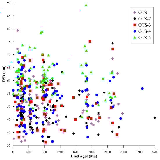 Since the plot of 25 μm was selected, the size of the zircon grains was relatively fine. The equivalent spherical diameter (ESD), which is the cube root of the product of lengths of the three axes [], was distributed from 36.21–89.18 μm and mainly distributed from 36.21–62.92 μm. The mean ESD of analyzed zircon grains in OTS-1 to OTS-5 are 50.83, 48.89, 52.47, 53.07, and 61.08 μm, respectively (Table S2).