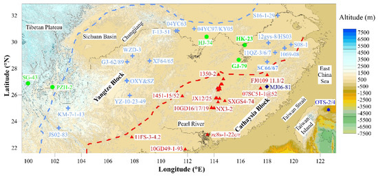 Distribution of Paleoarchean detrital zircon grains in the south China and East China Sea. Grains in the Yangtze Block, Cathaysia Block, Yangtze River Basin, and Minjiang are marked by light blue cross, red triangle, green circle, and dark blue diamond, respectively. The location of the Yangtze Block and the Cathaysia Block modified from references [,,]. Please refer to Table S3 and references therein for detailed data of ages and location. The light blue and red dotted lines roughly define the position of the Yangtze Block and the Cathaysia Block, respectively. Topographic data comes from https://www.gebco.net (accessed on 1 December 2021).