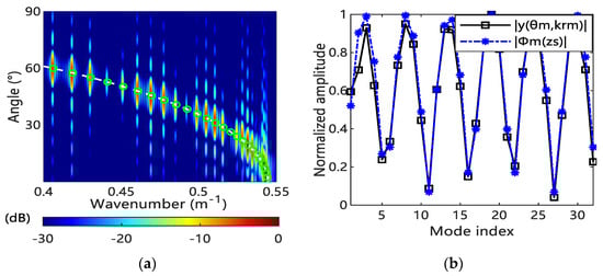 where  is the sine of the mode m propagation angle [],  is the moving distance in each block. If the beam and wavenumber direction are offset from any modal propagation angle () and modal horizontal wavenumber (), both Equations (8) and (9) obtain small numbers. Conversely, when there is a match, the beam-wavenumber spectrum given by Equation (7) appears a peak value, which indeed means for twice modal separation. The spectral peak can be obtained as []