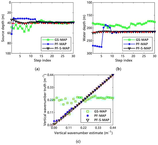 The effectiveness of three filters for source depth and water depth joint tracking is tested using beam-wavenumber outputs in Figure 3a. Figure 4a,b shows the estimated values of source depth and water depth obtained for the GS-MAP (square-marked line), the PF-MAP (stars-marked line), and the PF-S-MAP (triangles-marked line) changes over the steps along with the true trajectory (dashed line). The GS-MAP and the PF-MAP absolute error estimates for source depth initially rise before the twelfth step, whereas the PF-S-MAP estimates are close to the truth at each step. Figure 4b,c shows that the GS-MAP yields poor performance in tracking water depth and vertical wavenumber parameters, but the PF and the PF-S used here showed success. It is proven that our method using PFs can be promising for the source depth and water depth joint tracking problem in an ideal waveguide.