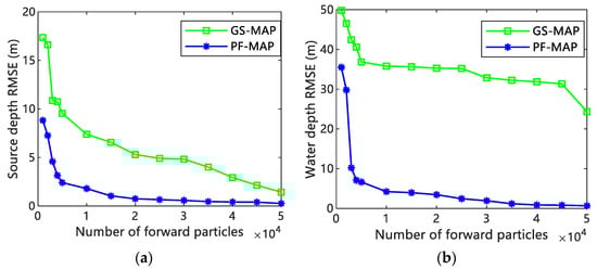 The performance of all filters degrades at the number of forward particles under 5000 because the PPDs of source depth and water depth parameters cannot be comprehensively captured with there are only a few particles. As the number of forward particles increases (more than 5000, less than 30,000), the RMSE of the source depth and water depth for the PF-MAP is much smaller than the GS-MAP in Figure 5a,b. The RMSE of the water depth in the GS-MAP stays above 20 m and is much higher than the PF-MAP in Figure 5b even if there are sufficient forward particles (about 50,000). The PF performance is gradually shown to be superior and reduces particles’ computational complexity.