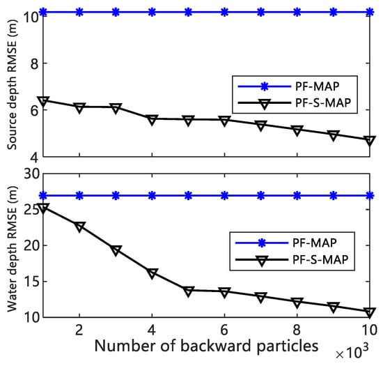 Figure 6 shows the RMSE of the first 10 steps for the PF-MAP (stars-marked line) and the PF-S-MAP (triangles-marked line) with fixed forward particles (10,000) as a function of the number of backward particles. Adding the smoother helps to decrease the RMSE of the first 10 steps of source depth and water depth for the PF-MAP. Specifically, the panel on the top shows that the RMSE of the source depth reduces by about 4 m when the number of backward particles is 1000. As the number of backward particles is increased to 5000, the RMSE of the water depth can be greatly reduced, by about 13 m in the bottom panel. The smoother with a few numbers of backward particles can improve the PF estimation accuracy at initial steps, especially for water depth.