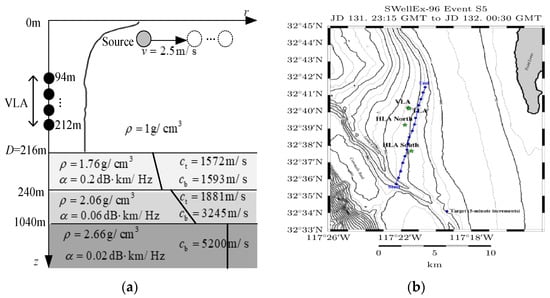 The SWellEx-96 Event S5: (a) The layered waveguide with sound speed profile, VLA, and geo-acoustic parameters; (b) The path of a surface ship in blue towed a deep and a shallow source during the 75 min VLA recording.