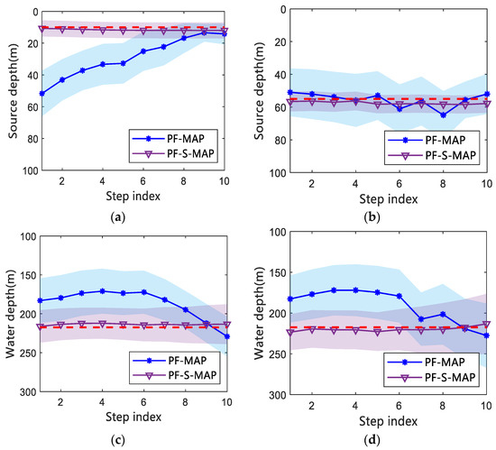Figure 8c,d displays that the PF-MAP are not close to true values until the last two steps for tracking results of water depth, while the PF-S-MAP yields good performance at each step. These phenomena are contributed to by the inevitable prior modeling bias in the state equation. If the real values of the state parameters evolve differently from this state evolution model, the PF may be unable to track these changes immediately. For example, the actual environment used here is more complex, with the bias of the assumption for the state equation. Even though the measurement equation may tell the PF that the vertical wavenumber parameter is changing in an unexpected way, the PF may ignore the measurement information if this contradicts the state evolution model. The smoother is the only difference between the PF and the PF-S. This reveals that adding an additional smoothing procedure helps to reduce the impact of state modeling errors.