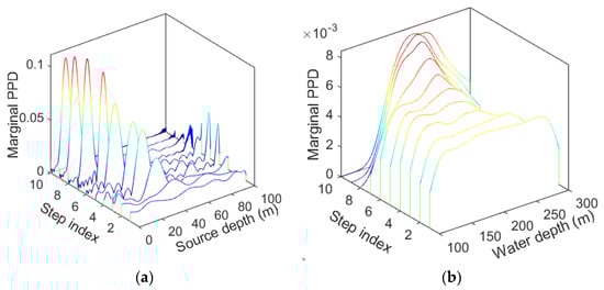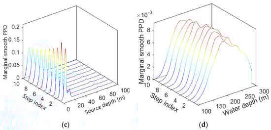 An uncertainty analysis was carried out to assess the advantages of the smoother. We take the 9 m source scenario for the SWellEx-96 Experiment as an example. The evolution of marginal PPDs and marginal smooth PPDs of source depth and water depth parameters at all steps is given in Figure 9a–d.