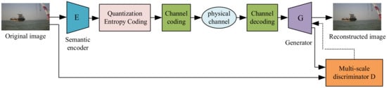 The proposed SC-IRT algorithm framework is illustrated in Figure 1. The image source collected by the USV is first processed by the semantic encoder (E) to extract semantic information, which represents the low-dimensional latent semantics of the autoencoder network. Then, the semantic information is quantized and entropy-encoded before being transmitted through the physical channel. The semantic decoder consists of a generative adversarial network (GAN), which includes a generator (G) and multi-scale discriminator (D). The generator decodes the semantic information to reconstruct the image. The multi-scale discriminator engages in adversarial training to discriminate between the original image and the reconstructed image. The autoencoder architecture demonstrates excellent performance in extracting semantic information from images. It compresses the image data into a low-dimensional latent space that can be used for image reconstruction. The downstream portion of the autoencoder can be replaced with a network structure related to semantics, such as a generative adversarial network. The SC-IRT algorithm consists of a semantic encoder including an autoencoder and a feature extraction network, a physical channel, and a semantic decoder based on a GAN, which can achieve low-bit-rate image transmission and reduce the loss of semantic information during the transmission process.
