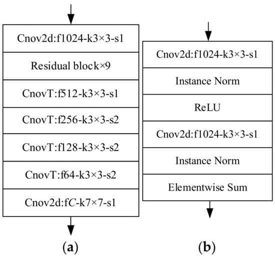 First, the semantic information is convolved with a convolutional block, which includes one convolutional layer, one instance normalization layer, and one ReLU activation function layer. The convolutional kernel size is 3 × 3, stride is one, and the number of channels is 1024. Next, there are nine residual blocks, and each residual block consists of two convolutional layers, two instance normalization layers, and one ReLU activation function layer. The convolutional layers have a kernel size of 3 × 3, stride of one, and 1024 channels. After that, there are four upsampling blocks, each including one deconvolutional layer, one normalization layer, and one ReLU activation function layer. The kernel size is 3 × 3, stride is one, and the number of channels is 512, 256, 128, and 64, respectively. Finally, there is a convolutional layer with a kernel size of 7 × 7, stride of one, and the number of channels is C.
