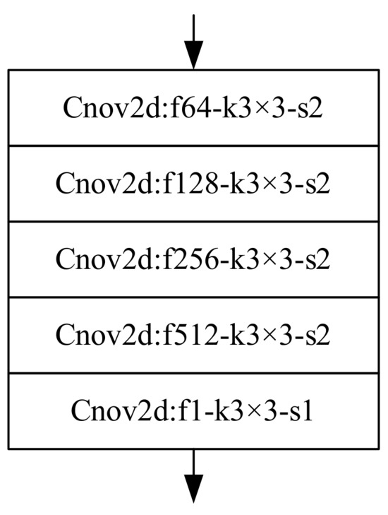The encoding network consists of six convolutional layers, including one convolutional layer with a stride of one and a kernel size of seven, four convolutional layers with a stride of two and a kernel size of three, and one bottleneck layer with a stride of one and a kernel size of three. The bottleneck layer has a channel depth of C. The specific parameter settings for each layer of the encoding network are shown in Figure 2. It is assumed that the input image size is , where w, h, and c represent the width, height, and depth (number of color channels, for example, in an RGB image, c is 3) of the image, respectively. The image undergoes several downsampling operations through the layers. This results in a feature matrix of 1024 layers size , where the width and height of the feature matrix are 1/16 of the original input image. This significantly reduces the amount of data. Finally, the feature matrix is fed into the bottleneck layer for dimensionality reduction. The bottleneck layer controls the bit rate of the low-dimensional latent semantic representation by its channel depth C. The final semantic information obtained is a low-dimensional latent semantic w with a size of . A LeakyReLU activation function is applied after each convolutional layer to enhance the non-linear relationships between adjacent convolutional layers.
