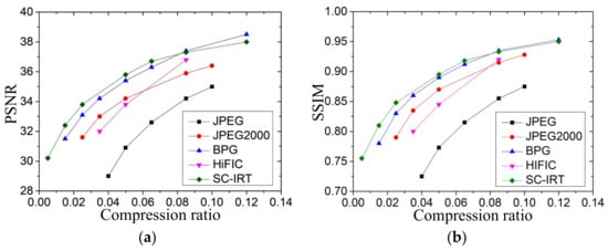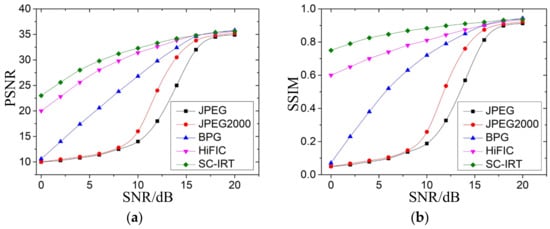In this paper, the proposed SC-IRT semantic codec algorithm is compared with commonly used coding and decoding algorithms, including BPG [], JPEG2000 [], JPEG [], and the deep learning-based codec HiFIC []. A series of experiments are conducted to evaluate the performance of the SC-IRT algorithm for image semantic transmission in various scenarios.