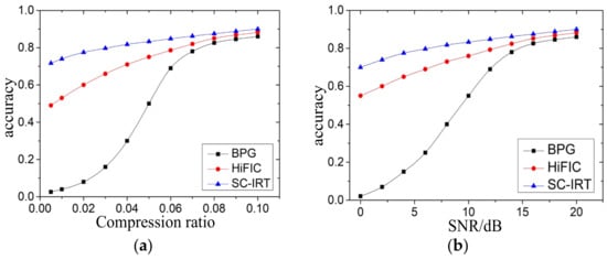 Since the main purpose of the visual image transmission of USVs in this paper is image object detection, in order to verify how different transmission schemes, different compression ratios, and different signal-to-noise ratios affect the accuracy of image object detection after transmission, the SC-IRT scheme is compared with the traditional BPG and HiFIC schemes, and the results are shown in Figure 8. Figure 8a shows the comparison of object detection accuracy using the YOLOv7 algorithm for images transmitted under different compression ratios. The lower the compression ratio, the more image information is compressed and the less transmission bandwidth is required. When the bandwidth is limited and does not support the transmission of all semantic information, the BPG and HiFIC algorithms do not treat the important information of images differently but compress all information uniformly; meanwhile, the SC-IRT algorithm proposed in this paper considers the relationship between specific intelligent tasks and semantic information, always transmitting the most important part of semantic information to meet different compression ratios. From the figure, it can be seen that compared with the traditional BPG and HiFIC transmission schemes, the SC-IRT scheme has more obvious advantages at lower compression ratios. Especially when the compression ratio is less than 0.02, the image object detection accuracy transmitted using the SC-IRT scheme can still remain above 0.7, far higher than the BPG and HiFIC schemes.