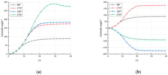 In Figure 5a, without optimization of the rotary direction, the target azimuth angles are 90°, 175°, 185° and 270°, and the actual azimuth angle smoothly approaches the target value. The angle finally settles at 90°, 175°, 185° and 270°, respectively, and the direction of the rotational response is consistent. In Figure 5b, with the optimization of the rotary direction, the target azimuth angles are 90°, 175°, 185° and 270°, and the actual azimuth angle again smoothly approaches the target value and finally settles at 90°, 175°, −175° and −90°. The results show that when the expected azimuth deviation is greater than 180°, through the azimuth optimization strategy the direction of rotation of the thruster is automatically selected as that having the smaller deviation, and the rotation time is reduced.