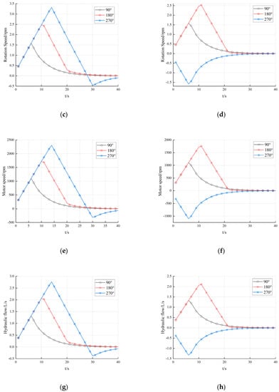 In Figure 5i, without optimization of the rotary direction, the target azimuth angles are 90°, 180° and 270°, and the hydraulic pressure of motors increases from zero to maximum values of 21 MPa, and decreases from 21 MPa to −21 Mpa. In Figure 5j, with the optimization of the rotary direction, the target azimuth angles are 90°, 180° and 270°, the output torque of motors gradually increases from zero to maximum values of 250 N.m and the output torque of motors gradually decreases from 250 N.m to minimum values of −250 N.m. Then, the output torque of motors gradually increases from −250 N.m to 0.