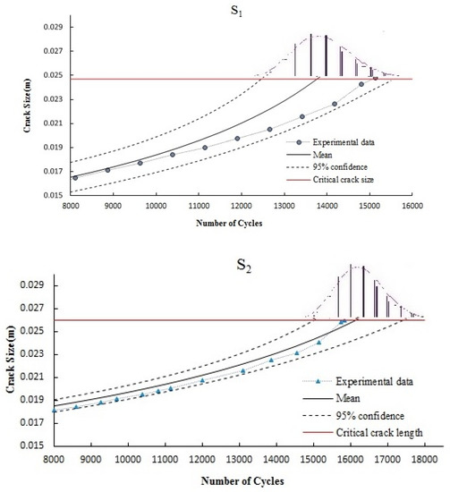 43]. It can be observed that the estimated crack growth is in acceptable agreement with the experimental results. Although the mean values of the probabilistic model are different from the experimental results in some of the load cycles (particularly in the case of S