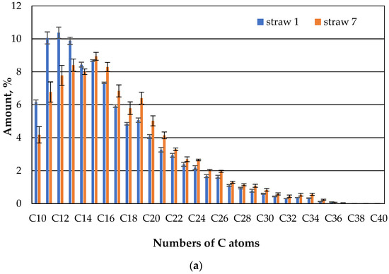 As discussed in [10], it was also found and confirmed here that the light fractions (hydrocarbon with a small number of carbon atoms) in the case of the straw without immobilized microbes already evaporated in the first week, and this composition hardly changed in the second week. It could be discussed here that the light fraction would have sorbed rather than evaporated, but then it should have reappeared after one or two weeks during the extraction due to the small straw pieces. This could not be confirmed here or in previously published research [10].