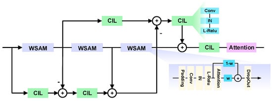 Self-Attention Residual Module. WSAM is the weight self-attention module, and the topology is shown in the bottom right corner. CIL blocks are used to change the number of channels of the image to facilitate feature computation. In the CIL block, we use a  convolution, an instance normalization, and a Leaky-Relu activation function.