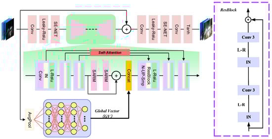 Based on SARM, we propose a new generator topology, shown in Figure 3. The structure is based on an improved U–Net as the main structure. In the structure, we have consider color priori information using global feature vectors, which are considered by [] to eliminate artifacts that appear in enhanced images in image enhancement tasks. Because there are often uniform color projections in underwater images, inspired by [], we have embedded these global vectors with color projection information at the start of the up-sampling operation. Moreover, we have added the self-attention mechanism in the middle of the skip connection, which can help the network recover the features better. In details, we have replaced all Batch Normalization (BN) layers with Instance Normalization (IN) layers because BN layers show a significant weakening effect when trained in a small batch.