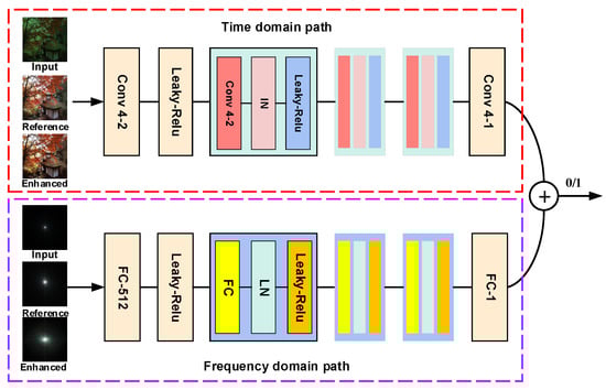 Ref. [] proposed that the Fourier transform changes the spatial coherence of the image, and it is not possible to use convolutional neural networks to extract the features of the spectrogram. Therefore, in this paper, we propose a dual path discriminator to consider enhanced images in both time and frequency domains. The discriminator can be divided into a time domain path and a frequency domain path, as shown in Figure 4. It is worth noting that the time domain here is relative to the frequency domain and is not the real existing time axis. On the time domain path, the input is a combination of a degraded image and a reference or enhanced image. We used a Patch–GAN structure to extract feature information from the input images. In addition, we used a spectral normalization operation to stabilize the training of GANs, which is shown to have significant effects on the generation task []. We input spectrograms corresponding to the inputs on the time domain path to the frequency domain path, which was composed of fully connected layers. At the end of the frequency domain path, we used a single neuron to output the probability. Finally, this probability was mapped to the same scale as the probability matrix of the time domain path by replication and weighted superposition to obtain the final probability matrix. It is well known that the discriminator is used to determine the source of the input image and to guide the generator in updating the weights during the backpropagation process. The output of the dual-path discriminator considers the authenticity of the input image from both time and frequency domains, which can further improve its guiding ability. In addition, different from the standard GAN’s discriminator, we used tanh as the activation function of the output layer to accommodate the hinge loss. The structure of the discriminator of the AUIE–GAN is shown in Figure 4. Therefore, the output probability matrix is: