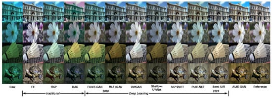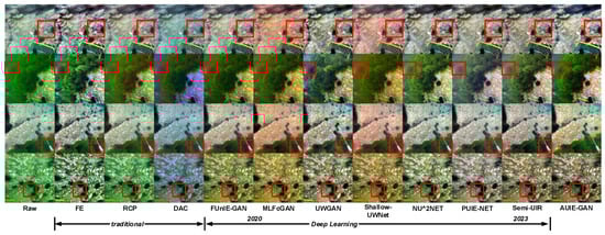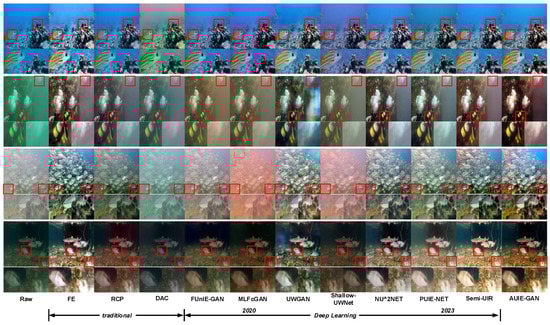Enhancement comparison of different methods. In this paper, we trained AUIE–GAN on 1130 images and compared it with 10 alternative approaches.