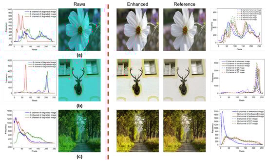 In Figure 6, the graphs on the left are frequency distribution of pixels on RGB space for each degraded image. The faulty color projection in the image is caused by the high frequency component of the corresponding channel. The graphs on the right are frequency distribution of the corresponding enhanced image and the reference image. The enhanced image has the same curve shape as the reference image, with the difference that the position of the curve is shifted, which is expressed in the image as a difference in brightness and contrast.
