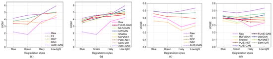 Complex underwater environments cause uncontrollable degradation of the images acquired by underwater imaging equipment. Present UIE methods are weakly adaptive, making them less effective in enhancing some specific image styles (e.g., the red noise that appears in the FE method). To further illustrate the contribution of AUIE–GAN, we divided U45 and Challenge60 into four categories according to degradation styles, which are blue, green, haze, and low-light. Based on the classification, we performed independent quantitative calculations for each class of images to evaluate the enhancement of different models for different styles of images. The quantitative results are shown in Table 3 and Figure 10.