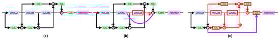 Pruning of SARM at different stages. (a) is the complete SARM, and (b,c) reduce one WSAM in turn. Significantly, model pruning would break the flow of the feature maps, so we jumped the connection to these locations where the corruption occurred. The role of the convolution layer that appears in the figure was to balance the number of parameters of the model, and the size of the perceptual field is 3.
