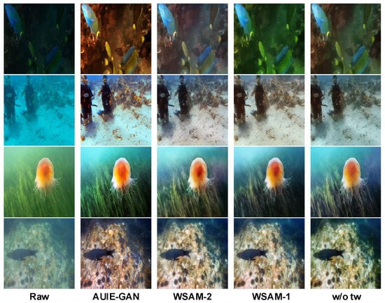 Quantitatively, the complete model achieved the highest values of evaluation metrics. Incomplete models showed varying degrees of indicator jitter, which may be caused by changes in the signal flow of the model during the pruning process. Compared to the model with a single WSAM module, the complete model improved by 12.65% in the UIQM metric and 25.31% in the UCIQE metric; the trainable weight also had a significant improvement on the model, with 9.33% and 24.11% improvement in the UIQM and UCIQE metrics, respectively. However, the need for calmness is that quantitative analysis had a certain result bias and needed to be considered in combination with qualitative analysis [].