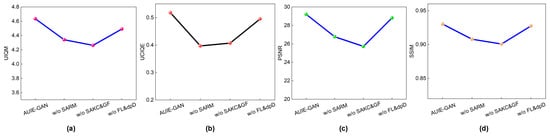 Quantitative experimental results were shown in Figure 14. Compared with the complete model, ablation models showed some decreases in all evaluation metrics. Furthermore, for different evaluation metrics, the lowest point of the curve appears in different models. In general, the Self-Attention Skip Connections and Global Feature vectors of U–Net had the greatest enhancement to the model.