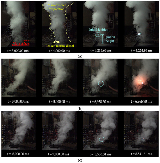Figure 3 shows the ignition process of the marine diesel on the hot surface in the ship engine room. Among the panels, Figure 3a shows the HSI behavior of the leaked fuel when the mechanical ventilation system is closed in the ship engine room. It can be seen that the rapid phase transition of the liquid occurs in the early stage of the marine diesel leaking towards the hot surface. As the hot-surface temperature rises to 480 °C, the marine diesel is almost in a constant state of film boiling. A very thin gas-phase interface is formed between the marine diesel and the hot surface, and the mode of heat transfer from the hot surface to liquid starts to change. Marine diesel is mainly composed of C12~C23 alkane, which belongs to a multi-component mixture [45,46]. When the marine diesel leaks and comes into contact with the hot surface at a time lapse of 3000.0 ms, a large amount of white smoke and mixtures are produced. The evaporation product of the marine diesel on the hot surface is fully mixed with the air in the ship engine room, and it basically forms a stable flammable mixture in the vertical space. At this time, the continuous heat transfer of the hot surface to the liquid surface is coupled with the thermal feedback effect around the ship engine room. When the marine diesel leaks for 4216.66 ms, the initial HSI behavior at high temperatures occurs instantaneously. In the images collected from the high-speed camera, it can be clearly observed that the initial HSI occurs at a higher position above the hot surface. The distance between the ignition height and the leaked marine diesel is closely related to the hot-surface temperature and environmental factors. The initial HSI forms a fire core in the air above the hot surface, after which the fire core gradually increases in size and produces a bright flame, as shown in Figure 3a. Figure 3b–d present the HSI process of leaked hot marine diesel when the ventilated velocities in the engine room are 1.0 m/s, 3.0 m/s, and 5.0 m/s, respectively. As the mechanical ventilation in the ship engine room increases, the ignition height of the leaked marine diesel on the hot surface shows a downward trend. The analysis indicates that the main factor of this phenomenon lies in the influence and restriction of the airflow in the ship engine room. The high-temperature hot surface formed by equipment operation has a thermal radiation effect on the air in the vertical space when its temperature rises. While the hot air flows upward, the surrounding cold air fills below, forming an upward air convection. When the airflow velocity is limited, the marine diesel comes into contact with the vapor generated by the hot surface to form a vertical upward plume, and the superimposed upward trend of the heated airflow makes the HSI behavior occur in the space above the liquid level. When the airflow rate in the ship engine room gradually increases, the airflow impacts the hot air and disturbs the evaporation and air mixture of the marine diesel, resulting in a reduction in its upward kinetic energy. The vapor/air mixture gradually accumulates in the vertical space closer to the hot surface, and the HSI height also decreases. The results show that, within a certain range of ventilation intensity, the higher the airflow velocity, the more obvious the disturbance effect on the combustible gas mixture, and the HSI height will decrease after losing part of the rising kinetic energy.