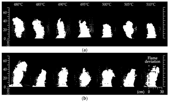 Figure 9 shows the flame propagation of the marine diesel ignited on the hot surface of the ship engine room. The image is binarized so that the deviation profile in the flame propagation process can be presented more clearly. Figure 9a presents the changes in the HSI-driven flame of the marine diesel without mechanical ventilation in the ship engine room, which is used here for a comparison and reference. Figure 9b–d show the changes in the HSI-driven flame of the marine diesel during the period when the ventilation velocities in the ship engine room change from 1.0 m/s to 5.0 m/s. Figure 9a shows that, after the marine diesel is ignited on the hot surface, the flame is transferred to form a stable pool fire. In the absence of mechanical ventilation in the ship engine room, the flame generated by the leaked marine diesel on the hot surface spreads vertically. With the increase in the combustion time, the residual oil above the hot surface is gradually exhausted, and the flame height gradually decreases. When the ventilation velocity in the ship engine room is 1.0 m/s, the flame generated by the marine diesel tends to deviate towards the wind side during the combustion process of the hot surface. This is due to the restriction of air entrainment on the upwind side, resulting in a gradual bias of the flame pattern towards the side with a reduced oxygen concentration. Experimental measurements of the shift changes in the flame morphology are shown in Figure 9. The figure reveals how the deviation of the flame form changes with the increase in the hot-surface temperature under different ventilation scenarios. When the hot-surface temperature reaches 480 °C, ventilation has a great influence on the flame form of the marine diesel. Under a ventilation velocity of 1.0 m/s in the engine room, the flame horizontal deviation of the marine diesel on the hot surface reaches 0.301 m. With the increase in the hot-surface temperature, the deviation scale of the flame morphology decreases greatly. When the hot-surface temperature rises to about 490 °C, the flame deviation formed by the marine diesel’s HSI decreases to 0.206 m. Compared with a hot-surface temperature of 480 °C, the deviation of the flame pattern is reduced by 31.6%. As the hot-surface temperature further increases, the flame deviation amplitude of the marine diesel gradually stabilizes at a ventilation speed of 1.0 m/s. When the hot-surface temperature rises to 510 °C, the deviation of the flame shape is less than 0.128 m. With the change in the ventilation intensity in the ship engine room, the flame spread gradually shifts from the windward side to the vertical center line. Figure 9c shows that the ventilation velocity in the ship engine room increases to 3.0 m/s; however, the flame deviation degree decreases during the experiment. This analysis indicates that, due to the increase in the air velocity in the engine room, there is more airflow that drives the flame plume on the hot surface to the vertical center of the hot surface. In Figure 9c,d, it can be observed that the flame plume force formed by the HSI of the marine diesel and the vortex formed by the smoke plume force jointly promote the balance of the flame transfer. If the ventilation velocity in the engine room further increases, a symmetrical airflow vortex appears on the windward and leeward sides. The two vortices show a motion trajectory in the opposite directions, and this balance causes the flame to present a vertical transmission form again. Figure 10 shows the flame deviation of the marine diesel’s HSI with elevated hot-surface temperatures. When the airflow velocity in the ship engine room increases to 3.0 m/s, the flame deviation at a hot-surface temperature of 480 °C is approximately 0.273 m, which is 9.3% less than that at a ventilation velocity of 1.0 m/s. As the hot-surface temperature increases, the flame deviation eventually decreases to 0.076 m when the hot-surface temperature approaches 510 °C. When the ventilation rate in the ship engine room increases to 5.0 m/s, the flame generated by the HSI of the marine diesel becomes weaker and smaller. Figure 10 shows that the flame deviation fluctuates between 0.005 m and 0.10 m with a constant change in the hot-surface temperature. If the ventilation effect in the ship engine room is further enhanced, the HSI-driven flame shifts from the windward side to the leeward side. At this time, several small-scale airflow vortices appear on the upwind side of the burning flame above the hot surface. Enhanced lateral airflow drives the flame plume to the leeward side, resulting in the change in the flame’s morphological characteristics.