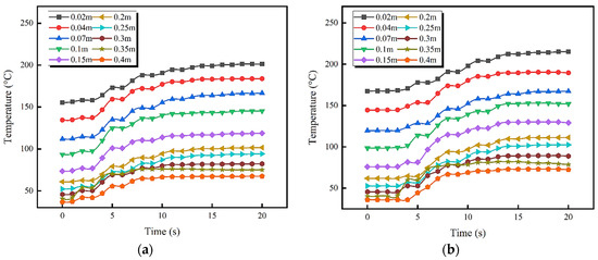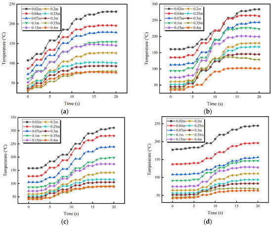 Temperature refers to the performance of heat in the initial HSI and the flame spread after HSI in the process of marine fuel leakage, and it serves as a key parameter of fire characteristics [47,48]. The difference in the HSI-driven flame and leaked fuel temperatures on a hot surface has a certain influence on thermal feedback, flame spreading speed, and oil mass loss rate. In this experiment, three rows of thermocouple bundles are arranged above the high-temperature hot surface in the ship engine room, with a total of 30 thermocouples installed in each bundle to collect temperature data from different vertical spaces. Figure 13 shows the temperature variation on the vertical center line during the HSI of the marine diesel. Among the panels, the typical hot-surface temperature of the ship engine room selected in this work ranges from 480 °C to 505 °C, and the ventilation velocity is set at 3.0 m/s. Due to the different spacing arrangements of the hot surface, the temperature data between 0.02 m and 0.4 m in the vertical space above the hot surface can be collected. Figure 13a indicates the vertical spatial temperature field distribution of the leaked marine diesel after it comes into contact with the hot surface when the temperature is 480 °C. It is found that, before the leaked marine diesel comes into contact with the hot surface, the temperature change at the highest point is close to that in the engine room. Due to the effect of thermal radiation generated by the hot surface, the temperature in the area near the hot surface is higher, exceeding 150 °C. The marine diesel comes into contact with the hot surface when the oil itself has a low temperature, which has a certain cooling effect on the temperature of the hot surface and significantly shortens the ignition time. Subsequently, the film boiling behavior of the marine diesel rapidly occurs above the hot surface, and it produces a large number of phase transition products. The generation of gas-phase products has a convective heat transfer effect in the vertical space, so the temperature in the vertical space begins to show an upward trend. The HSI of the marine diesel occurs when a particular concentration of combustible mixed gas is reached in the air direction space at a certain time. The temperatures at the vertical distances of 0.3 m and 0.35 m show a sudden jump, indicating that the initial fire core is formed in this region. This is consistent with the result showing that the HSI height of the marine diesel is 0.319 m in this scene, as determined with the high-speed camera. With the increase in the hot-surface temperature, the HSI delay time of the marine diesel is gradually shortened, and the temperature field in the vertical space shows such a changing trend. When the hot-surface temperature in the ship engine room rises to 485 °C, the temperature closest to the hot surface increases significantly. When the marine diesel reaches the HSI temperature, the temperature data at the vertical height of about 0.25 m to 0.3 m change dramatically. This indicates the location of HSI occurrence. This is consistent with the previous experimental results at the HSI height of 0.275 m. With the continuous increase in the hot-surface temperature, the HSI delay time of the hot surface of the marine diesel is further shortened. When the typical hot-surface temperature in the ship engine room rises to 500 °C, the temperature in the vertical space above the hot surface changes dramatically. Under the action of the high-temperature hot surface, the leaked marine diesel shows strong boiling heat transfer behavior on the hot surface. At the vertical height of 0.15 m above the hot surface, there are two obvious temperature rise phenomena. With the increase in the hot-surface temperature, the HSI time of the marine diesel is shortened. The temperature field distribution that the HSI height of the marine diesel appears between 0.1 m and 0.15 m when the hot-surface temperature is 500 °C, which is consistent with the actual situation. The results show that the leaked marine diesel has a strong phase transition and film boiling behavior with the increase in the typical hot-surface temperature in the ventilated ship engine room. The uneven temperature field distribution in the vertical space of the leaked marine diesel results in a local temperature jump, which reflects the correlation between the HSI position of the marine fuel and local temperature change.