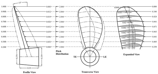 Blade preliminary design can be performed using one of the basic procedures such as a Burrill cavitation table or Keller’s equation. Keller formulated an equation for obtaining an early estimate of the required expanded area ratio (EAR). This equation provides the minimum required EAR, as shown in Equation (7) [,].