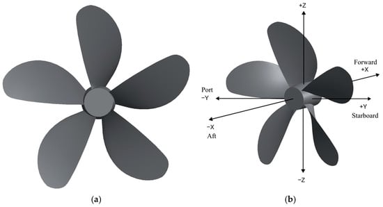 The propeller geometry was obtained from the table of general geometric properties for the B-series, as well as equations from Oosterveld and Van Oossanen []. Using a standardized parametric propeller series, such as the B-series, has an enormous advantage, as foils to form the blade sections can be generated with coordinates, as depicted in Figure 4. After computing the blade section coordinates, they were exported to create the 3D geometry shown in Figure 5a. Based on the hydrodynamic terms of ITTC [], the global Cartesian coordinate system (X, Y, Z) of the propeller was defined as outlined in Figure 5b. When looking from aft (−X), a positive rotational speed indicates clockwise rotation and a negative speed indicates counterclockwise rotation, following the right-hand rule.