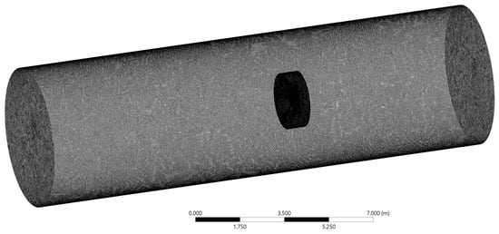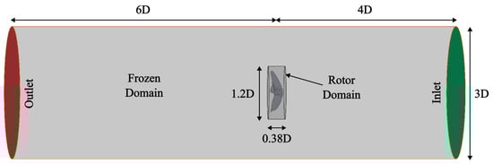 The computational domain of the study used a multiple reference frame (MRF), also known as the frozen rotor approach, as shown in Figure 6. The static or frozen domain was 3 diameters wide and 10 diameters long, to allow open fluid development after it accelerates through the propeller. The rotor, which is situated near the propeller, had a width of 0.38 diameters and a height of 1.2 diameters. Considering the size of the rotor domain is crucial, as it impacts the computational cost. If the domain is too large, this will increase the cost; on the other hand, if it is too small, this will result in the formation of large eddies near the propeller, leading to imprecise results. Meanwhile, the “rotor” subdomain was assigned an angular rotational speed n, subject to the advance coefficient J. In the “frozen” domain, a static condition was assigned. According to the MRF approach methodology [], the interface zone between subdomains was also specified.