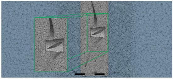 Three unstructured meshes (A, B, and C) were generated, varying the number of elements between 2.21 × 106 and 9.27 × 106. The tetrahedron method was applied to the complete domain, with a growth factor of 1.2. In the critical region near the propeller walls, the inflation technique was applied to increase the resolution and better represent the boundary layer, as shown in Figure 7 and Figure 8.
