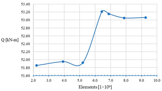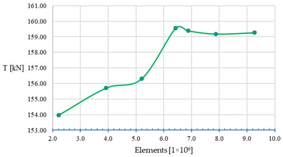 The plots in Figure 9, Figure 10 and Figure 11 show the convergence of the thrust, torque, and open water efficiency in the numerical model as the number of elements/nodes was increased to discretize fluid domains using the finite volume method (FMV). As the number of elements/nodes was increased, the convergence of the results in order to make them mesh independent became evident. The mesh selected for the study was mesh F, as it resulted in the first point of the convergence curve after the values had settled.