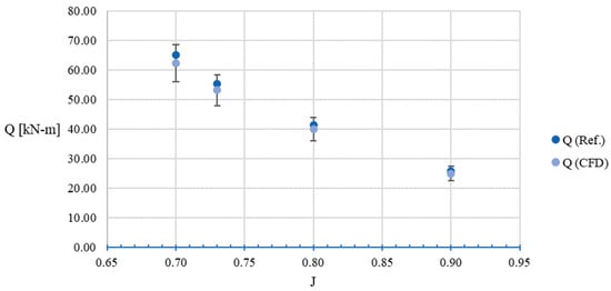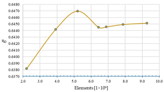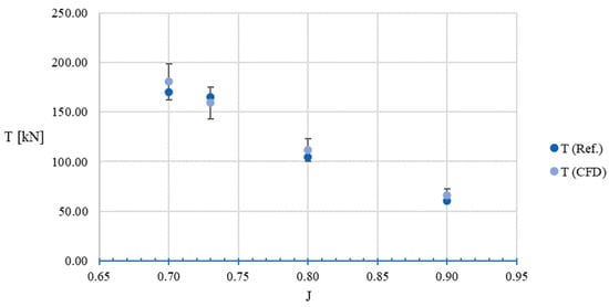 A mesh sensitivity study was conducted to estimate the balance between computational cost and mesh density, obtaining results with a good correlation compared with the experimental data, thus ensuring mesh independence. Metrics for seven meshes were analyzed, in order to meet the criteria established by ANSYS® Inc. (Canonsburg, PA, USA). [] of having a good mesh quality, as observed in Table 9. The numerical model was run with every mesh using fresh water in noncavitating conditions (Case II) to calculate the thrust (T), torque (Q), and corresponding open water efficiency (ηO). The results were then compared against experimental B-series data, as presented in Table 10.