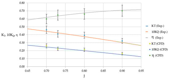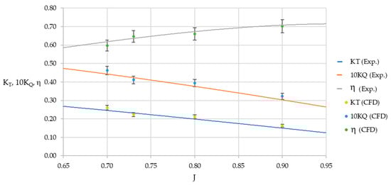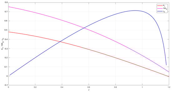 Usually, open water test characteristics are presented in dimensionless form and plotted in terms of KT, KQ, and ηO on a J-basis []. Their respective equations are as follows: